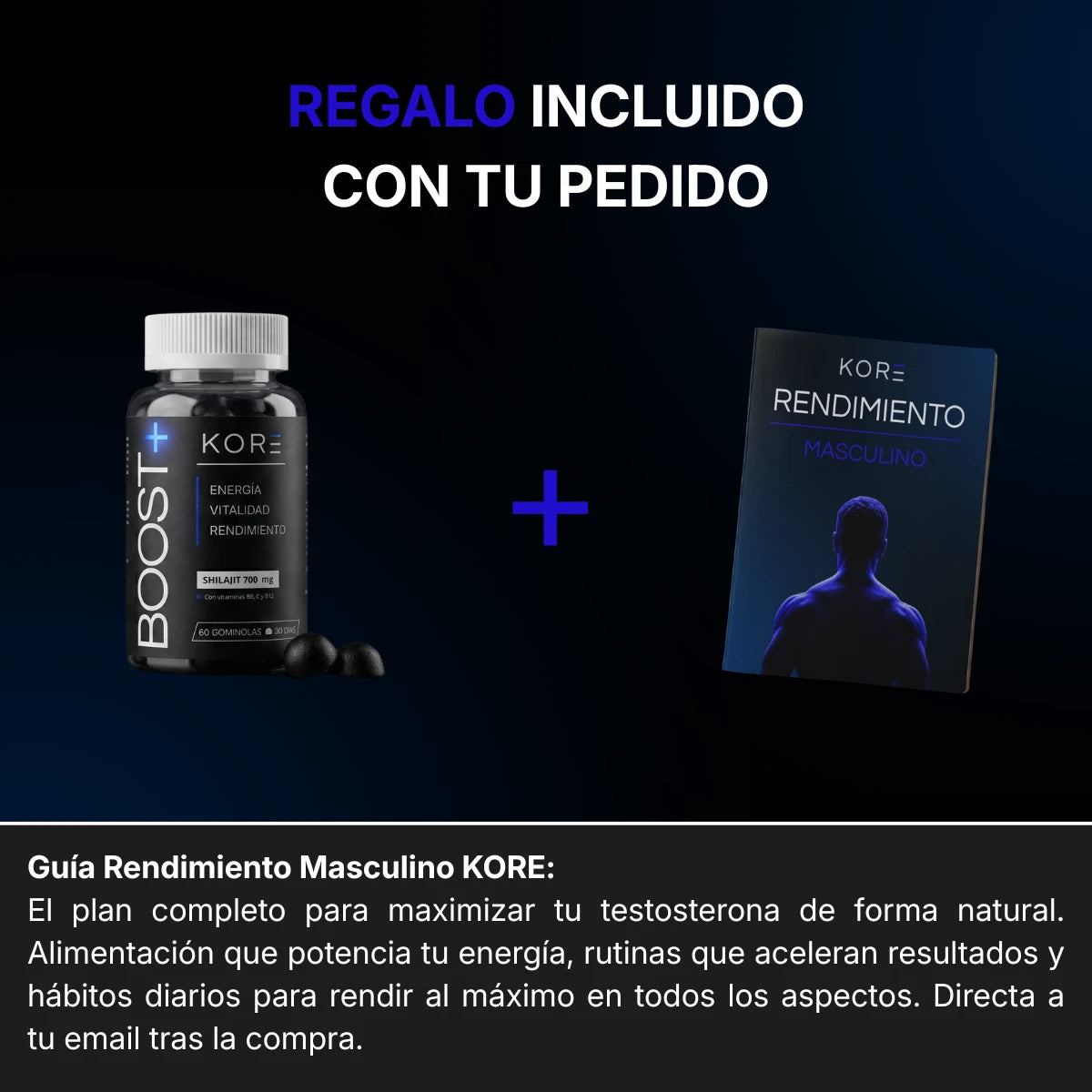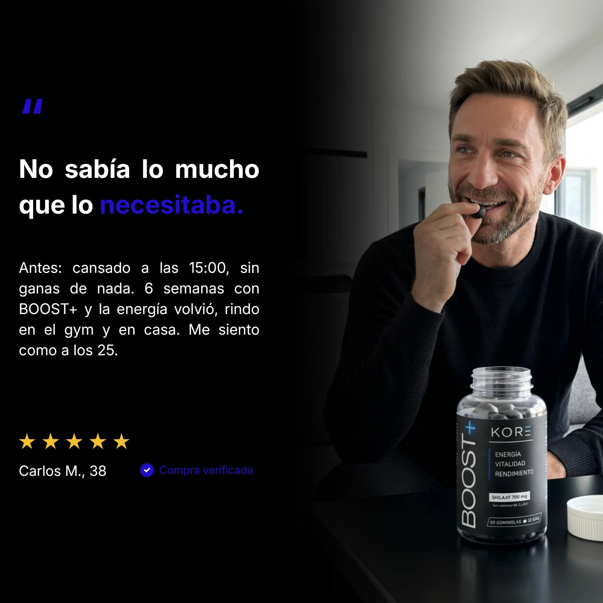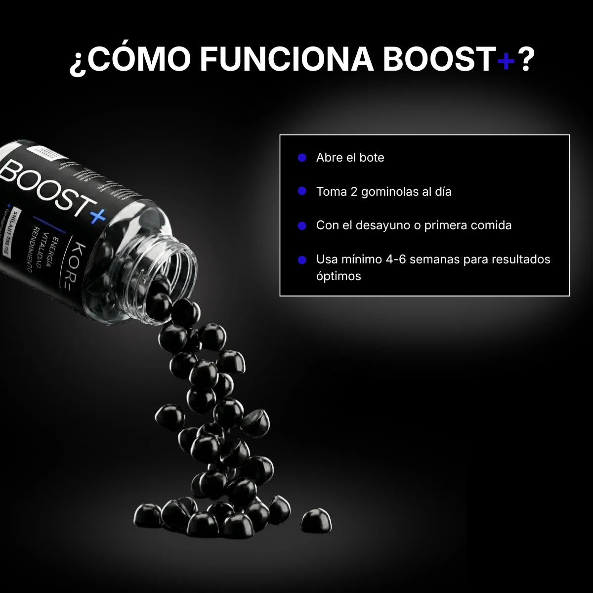KORE nació de una frustración: suplementos caros, etiquetas confusas y resultados que nunca llegaban. Queríamos algo diferente — ingredientes reales, dosis clínicas y cero relleno. Así creamos BOOST+: una fórmula directa con 700 mg de Shilajit puro, vitaminas C, B6 y B12, en un formato que de verdad te apetece tomar. Sin atajos, sin promesas vacías. Solo lo que funciona.