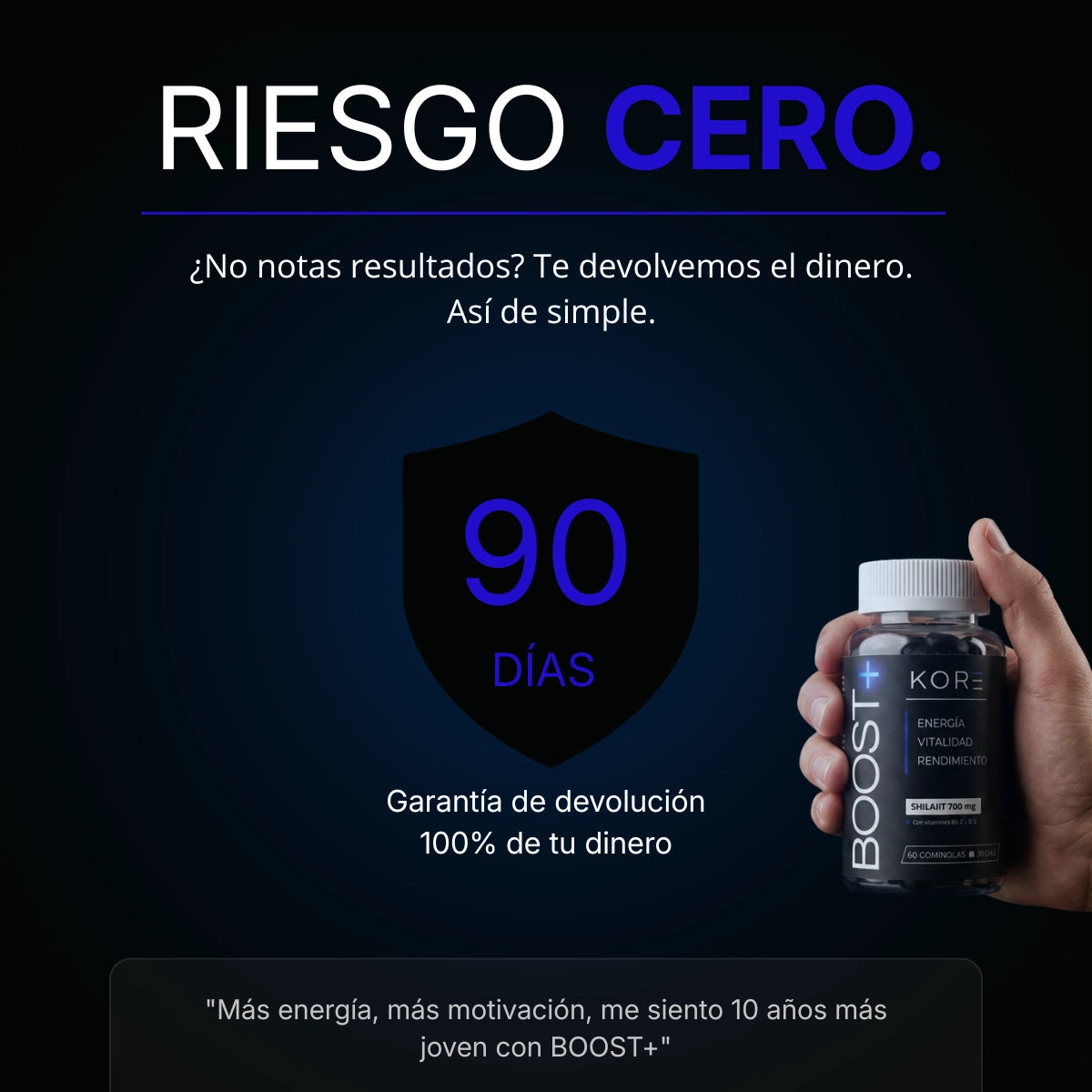 *Encuesta interna KORE (n=100). Uso diario de BOOST+ durante 90 días. Ingredientes activos con estudios clínicos publicados (Pandit et al., Andrologia 2016). Los resultados individuales pueden variar.